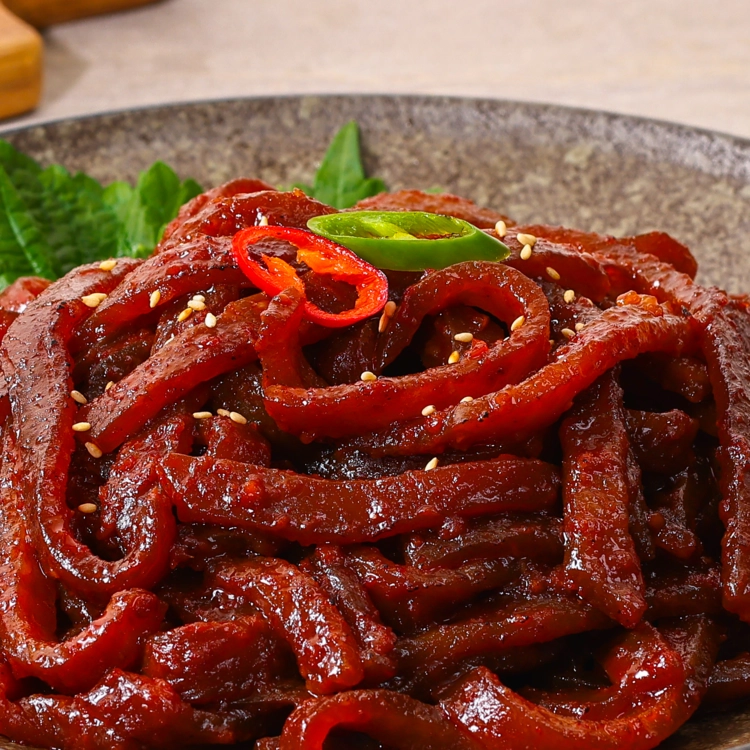 국내산 돼지껍데기를 슬라이스한 뒤 매콤한 양념을 더해 매콤쫀득한 맛이 일품인 제품입니다.