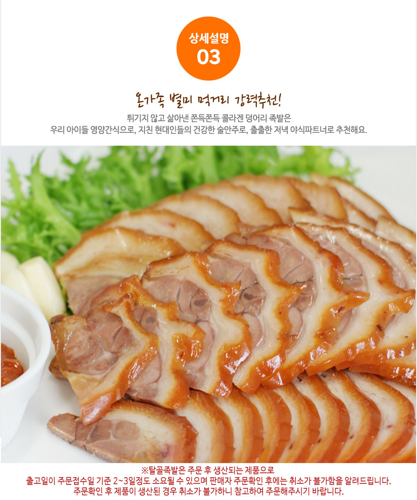 족발의 뼈와 살코기를 분리한 제품으로, 상차림이 쉬워 손님 접대나 식당에서 사용하시기에 좋습니다.